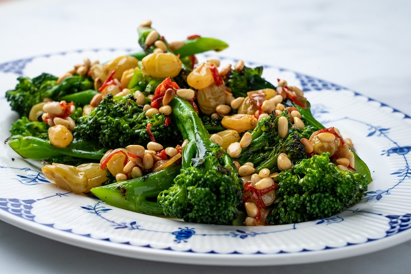 Grilled broccoli, golden raisins, pine nuts and chilli oil